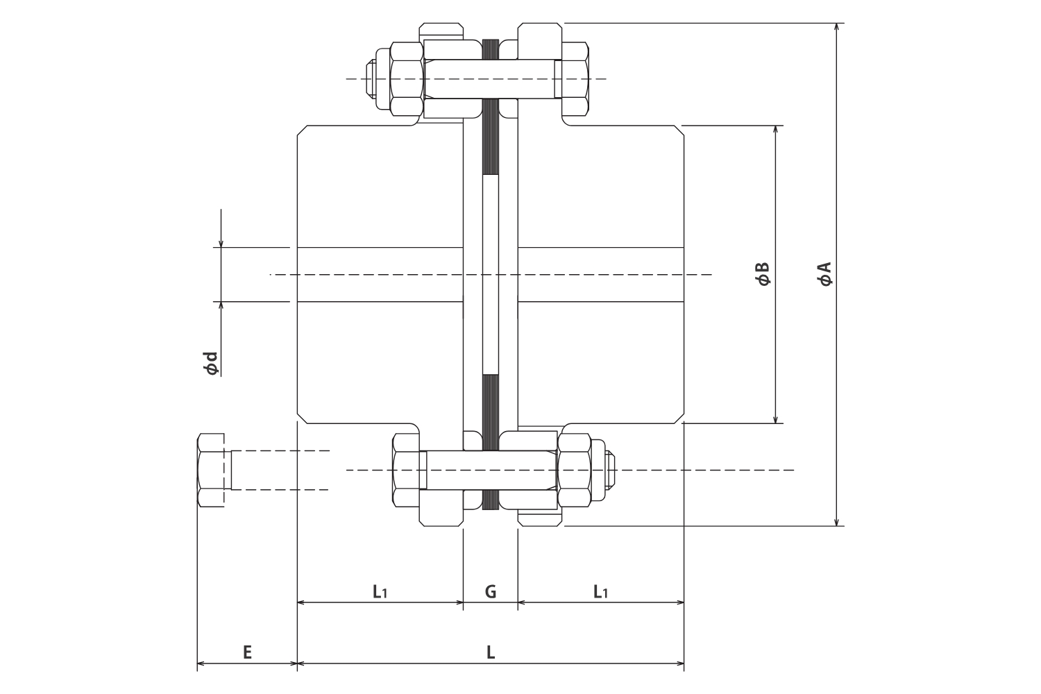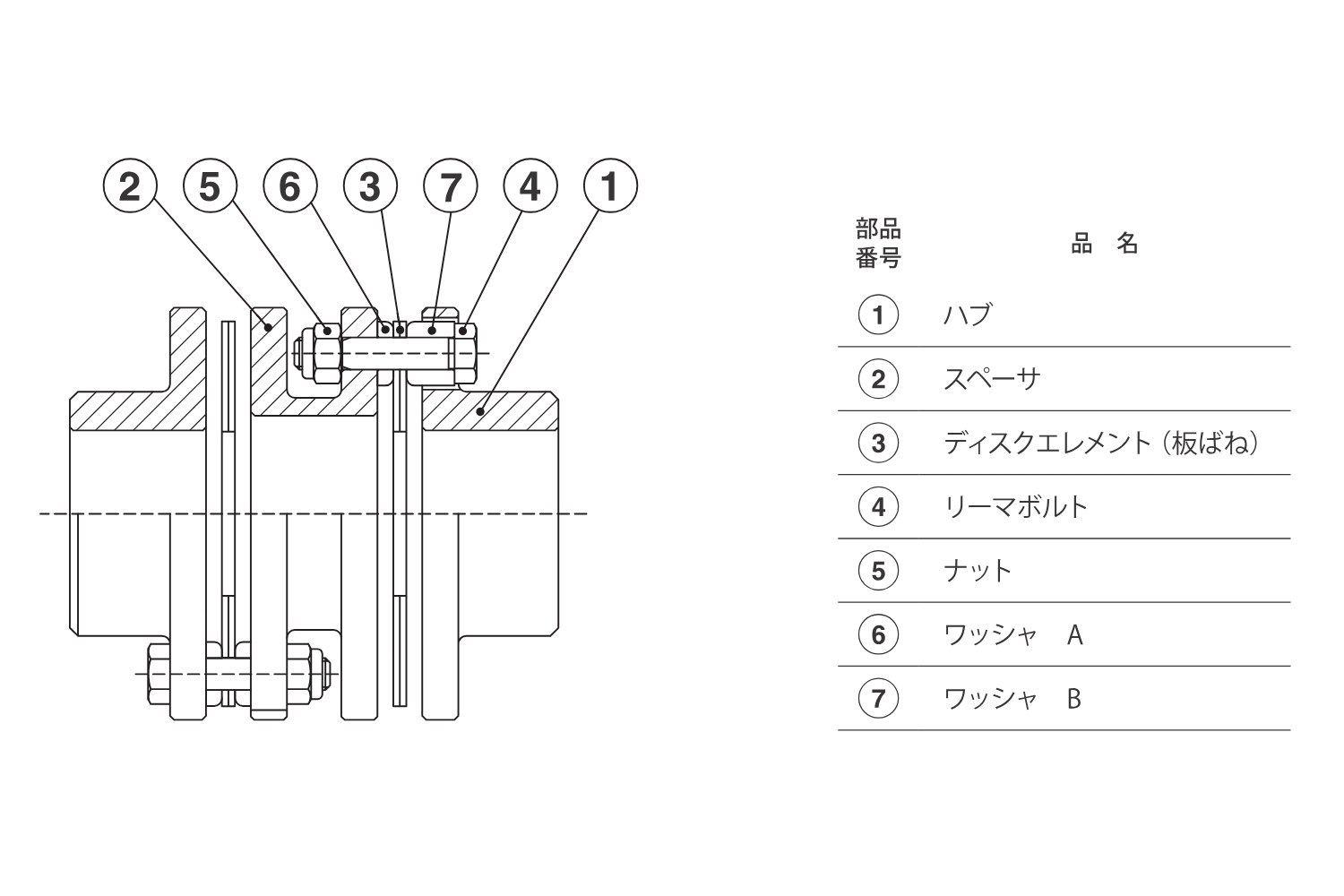ディスクエレメントはステンレス製薄板を積層してできており、過負荷・突発事故が発生し、一部のディスクエレメントが破損しても、リーマボルト・ワッシャを介して動力を伝達することができる構造となっています。